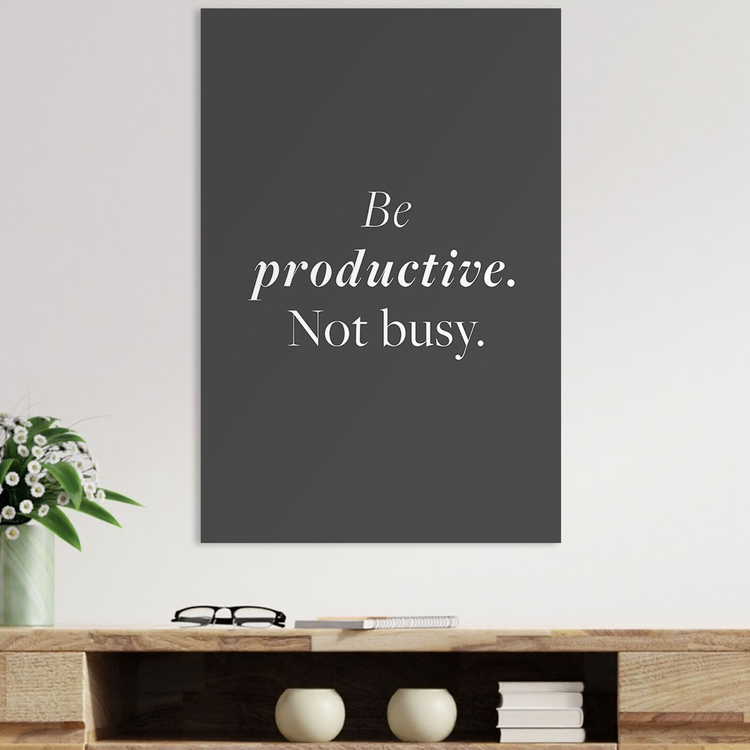 Der Spruch "be productive not busy" soll uns daran erinnern, dass wir in der Arbeitszeit produktiv sein sollen, aber geschäftig tun sollen. Ein wunderbarer Spruch, der an jede Wand gehört.