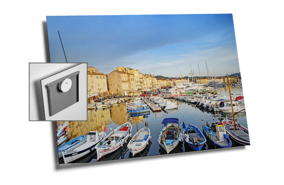 Mit den selbstklebenden Aufhängern befestigst Du Platten aus Aluminium oder Acrylglas in Sekundenschnelle an Wänden. Einfach das selbstklebende Stahlblech an der Rückseite Deiner Platte anbringen, die Exzenterscheiben an der Wand befestigen und die Platte aufhängen. Fertig!