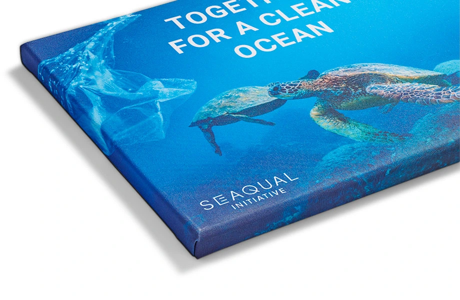 Wir unterstützen mit unserer Leinwand Recycling die Initiative SEAQUAL®, die sich aktiv gegen Plastikverschmutzung einsetzt. Die SEAQUAL® Initiative hat sich zum Ziel gesetzt Meeresplastik ein neues Leben zu geben und SEAQUAL® YARN ist ein Teil dessen. Das hochwertige Polyestergarn wird zu 10 % aus recyceltem Plastikmüll aus dem Meer und zu 9 % aus recycelten PET-Flaschen hergestellt. Dein Wandbild wird auf 260 g Recycling Gewebe aus SEAQUAL® YARN auf einem massiven Keilrahmen aus Fichtenholz gedruckt. Möchtest Du Deine Leinwand nachhaltig drucken lassen, entscheide Dich für unsere Leinwand Recycling.
