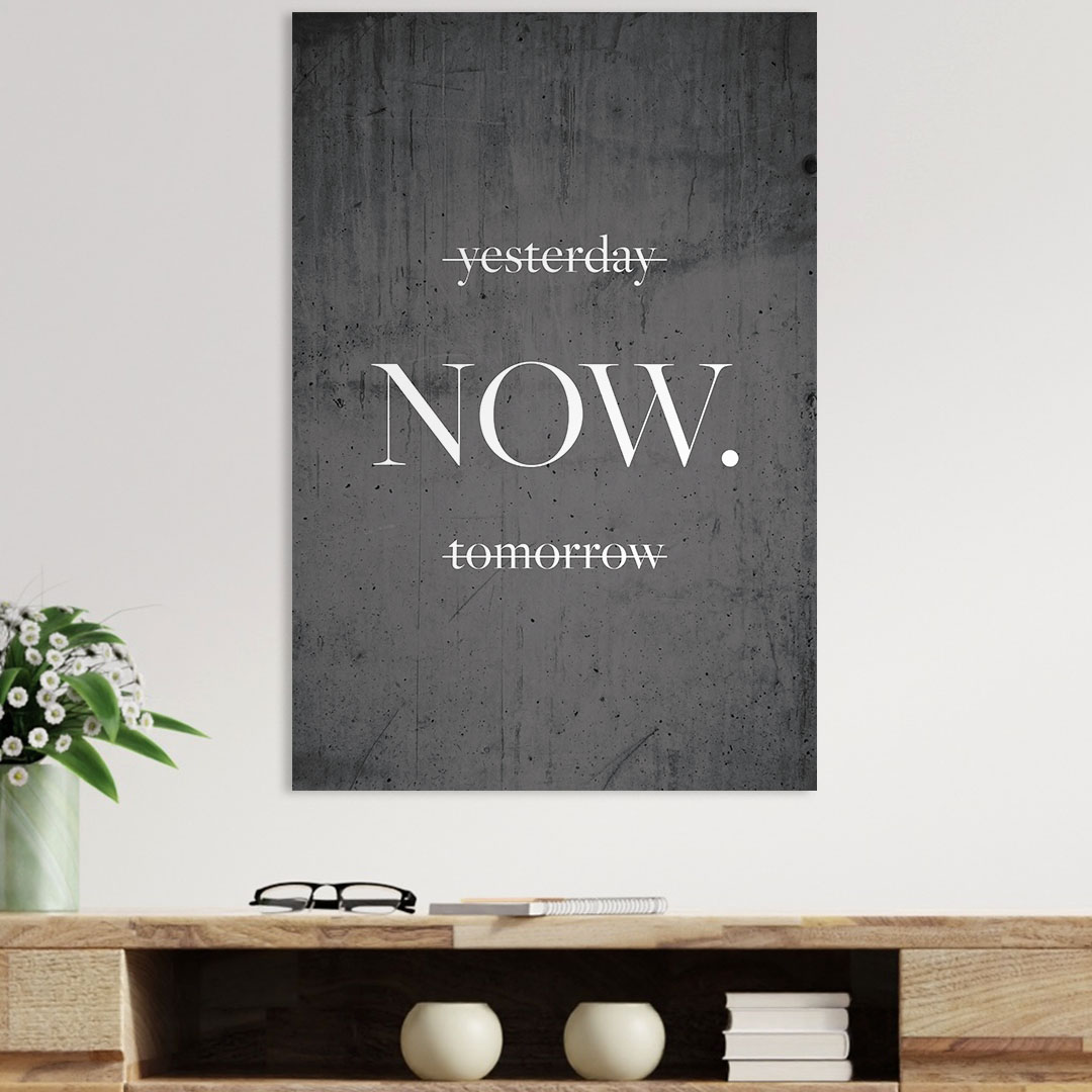 Ein moderner und stilvoller Spruch mit dem Text "Yesterday Now tomorrow". Der Motivations-Spruch ist einfach aber kraftvoll und ermutigend. Er soll daran erinnern, wie wichtig es ist, nichts zu verschieben.
